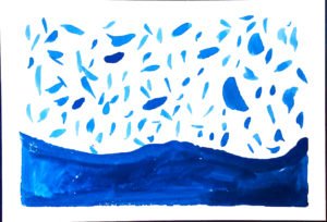 In this painting by a child, joyful rain tumbles from a heights while water rises up to greet it.