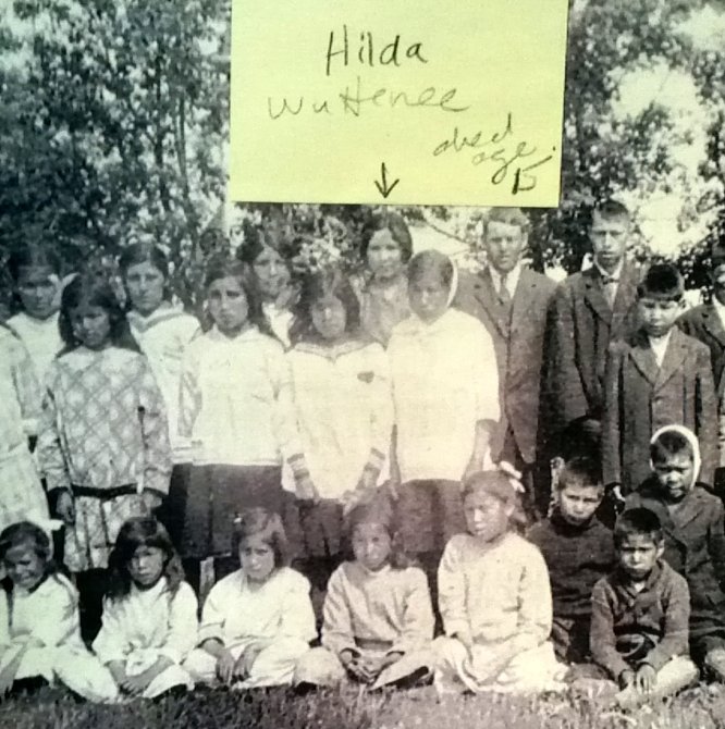 Archival picture showing children at St. Barnabas residential school. Inez Dieter’s sister Hilda is marked with the sticky note.