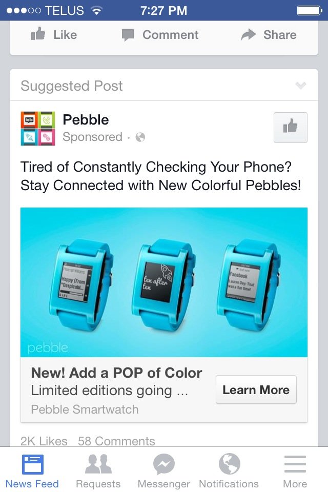 This advertisement, however, promoted on Facebook, is not a random post from a random company trying to repurpose an old idea. The development of a mobile device that you strap to your wrist is one of newest things to hit the mobile market. Apple is launching its own version of this very idea in early 2015. The “iwatch” will hit the market, and no doubt the watch-less generation will become a watch-wearing generation and then all our definitions of who is who will come crashing down.